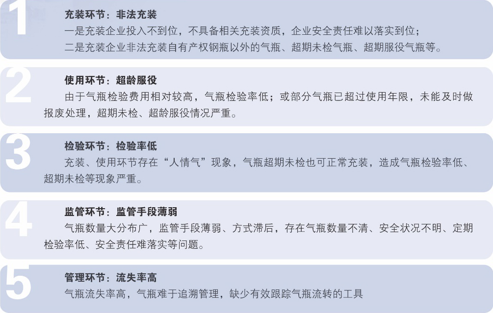 目前,我国拥有气瓶13698万只,气瓶充装单位16000余家,气体的安全生产、经营、储存、运输等环 节已是行业内的共同课题。仅以2015年为例,全国共发生特种设备事故和相关事故257起,其中,气瓶事故29起。我公司研发了液化石油气瓶综合管理系统。利用RFID、无线通讯等先进技术实现液化石油气瓶的全过程追溯管理,满足政府监管以及企业管理,为气瓶安全使用保驾护航。